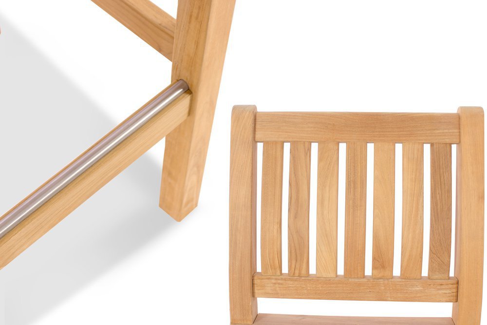 Best suitable for both contract settings and terraces in moderate-size home. Featuring elegant lines to capture the beauty of dining outdoors. Built from natural teak fine sanded, clean and smooth surface. It is easy to clean and maintain and the simple lines allow for design integrity and a longer lifespan.