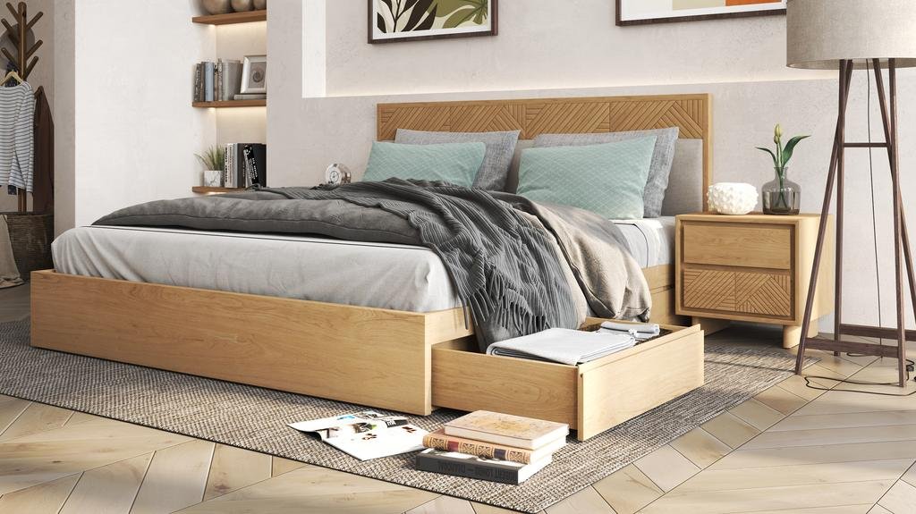 - Bed frames include space and wood slats and allow bedding to be tucked in
