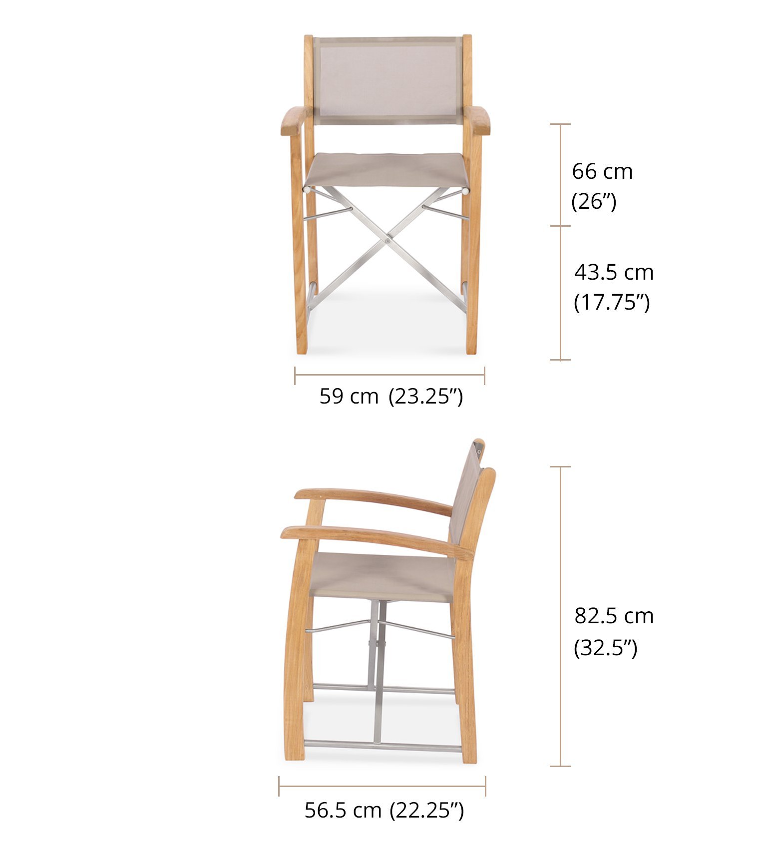 Modern dining chair that is highly comfortable and convenient for outdoor retreat. The teak frame enables it to withstand outdoor weather in minimal maintenance. Same goes to the batyline sling that resistant to UV radiation and fading.