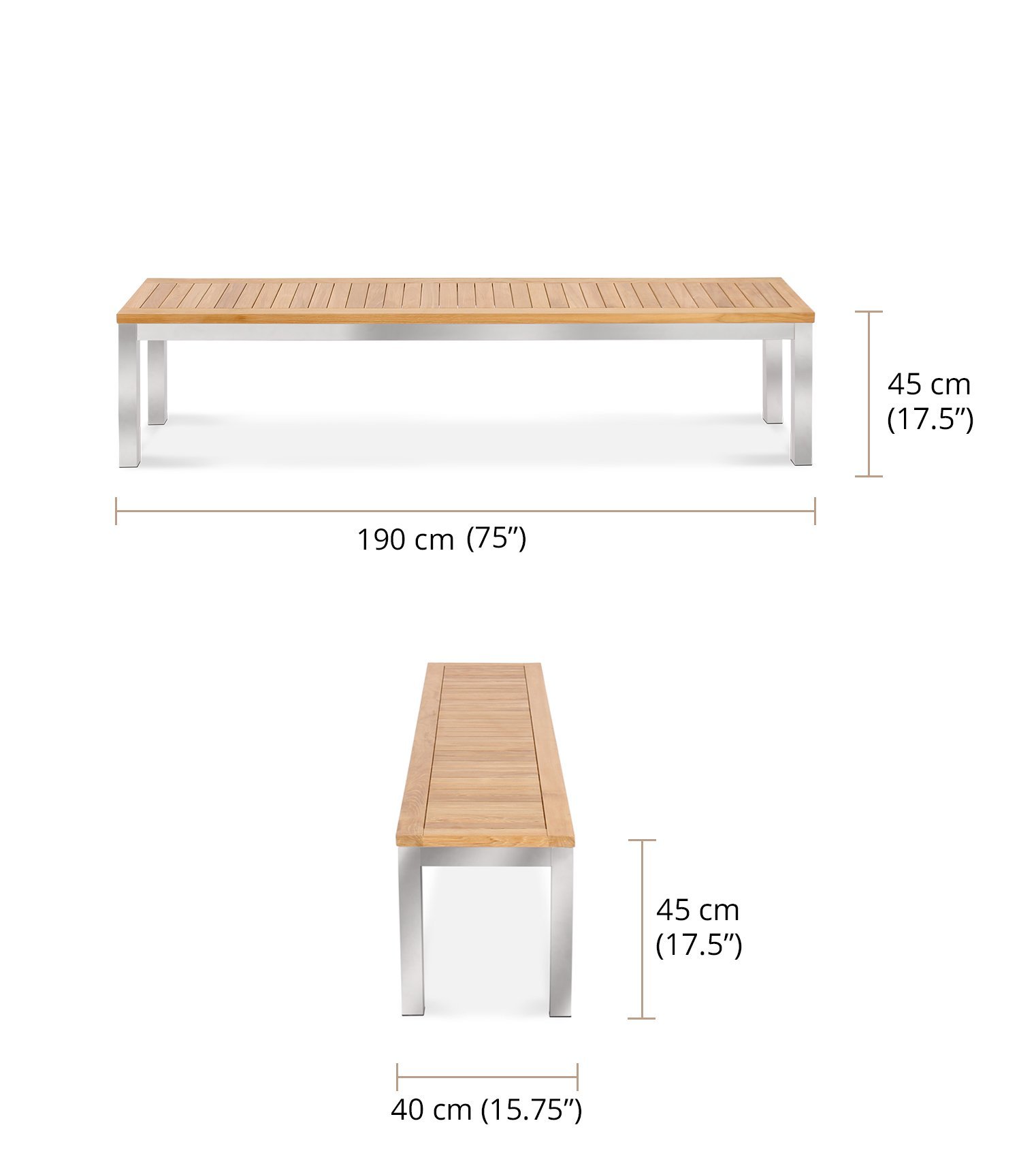 Extra large space for sitting, dining, or even reading a book in your backyard. The clean lines and modern design make this backless bench fitting for any setting. Left outside untreated, the exposed surfaces of the teak will become a soft silvery gray in years ahead that offers completely different aesthetic for your patio.